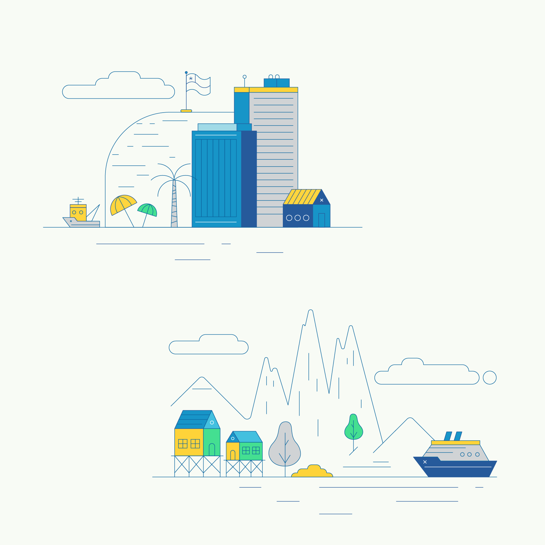 Ilustraciones de personajes y fondos para proyecto de animación.